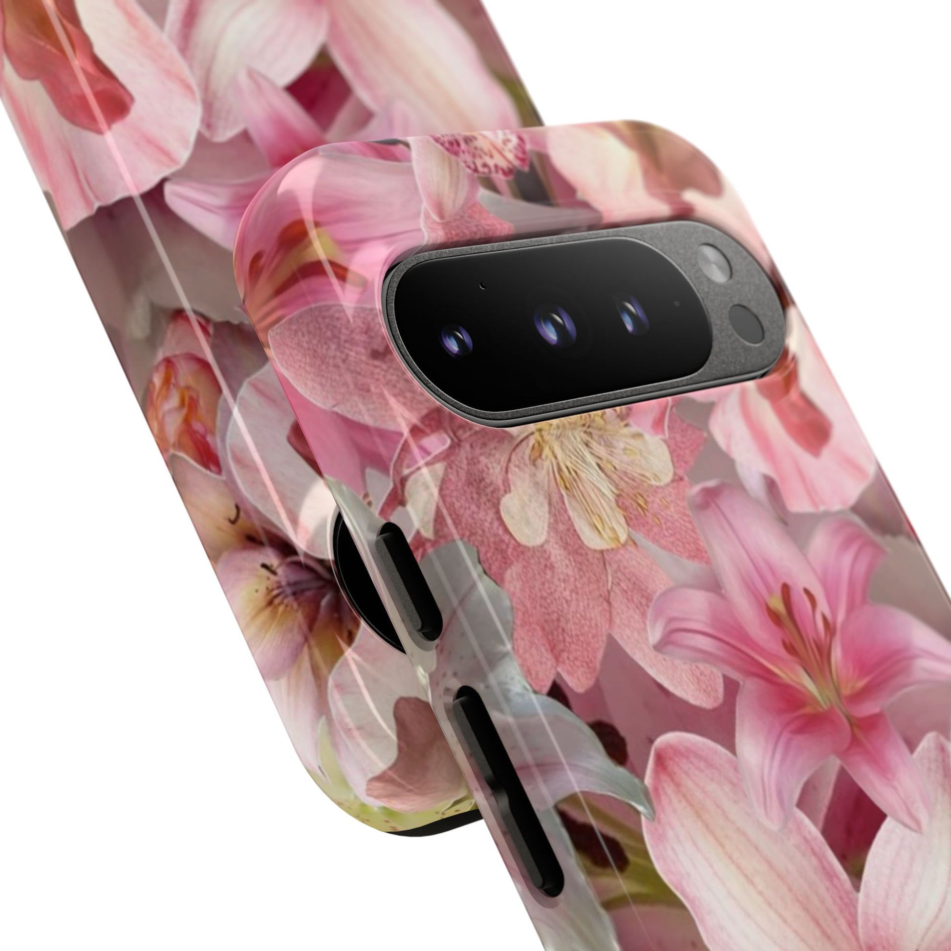 Matte & glossy tough case featuring lily flowers, providing durable protection against drops and tears. Perfect for adults looking for a stylish and protective phone case. Ideal for everyday use or as a gift for special occasions.